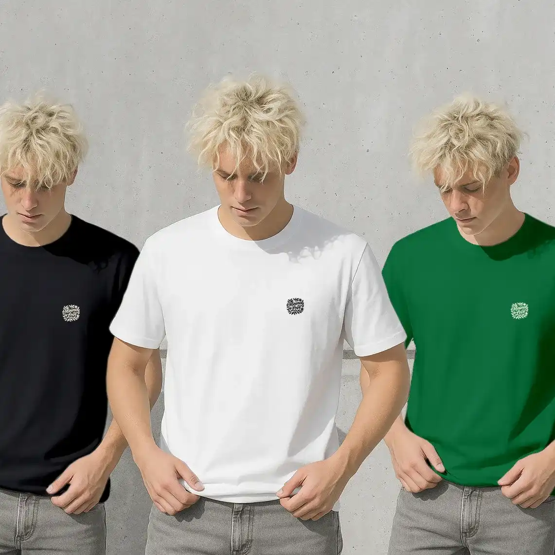Incluye tres camisetas de algodón peinado 160g, Colores: Blanco, Verde, negro, diseñadas para ofrecer suavidad, comodidad y un estilo versátil que se adapta a tu día a día.